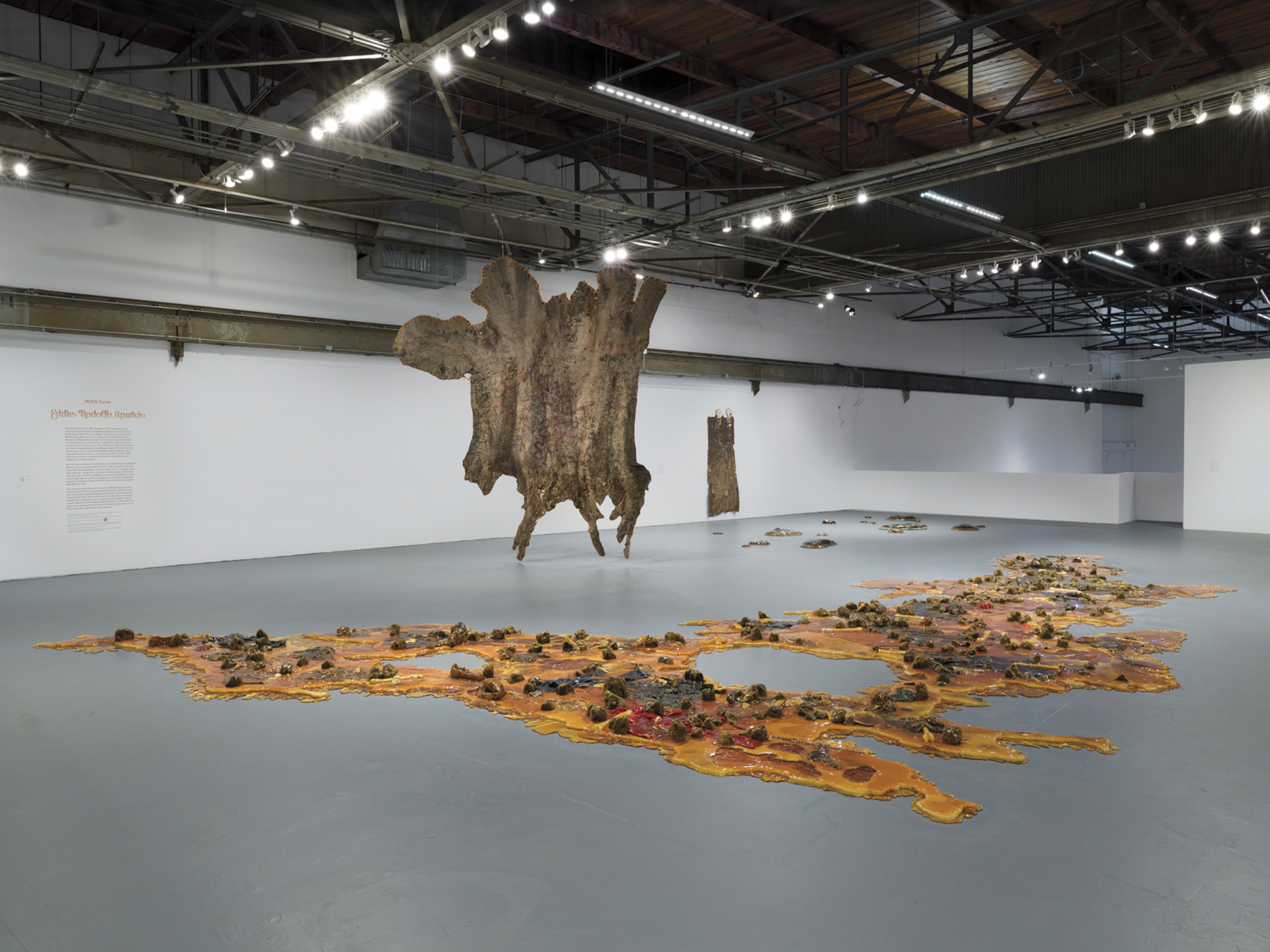 “El Playon” of the work’s title refers to a black scar that a volcanic eruption left in the earth more than a hundred years ago, just outside El Salvador’s capital city. The same area was used as a dumping ground for the bodies of the disappeared during the country’s 1980–92 civil war. Matching the shape of El Playon, 601ft2 comprises some 1,500 pounds of molten amber that mimics flowing lava as it’s poured over a collection of various objects: volcanic stones, specially fabricated ceramic bones, and various items found in MacArthur Park, a main hub for the Salvadorean community in LA. It also includes letters and newspaper clippings related to the civil war that are difficult to read through the amber shell. After the show opened, Aparicio learned that the body of his half-sister had been discovered in El Playon by their father, artist Juan Edgar Aparicio, who fled El Salvador shortly afterward.